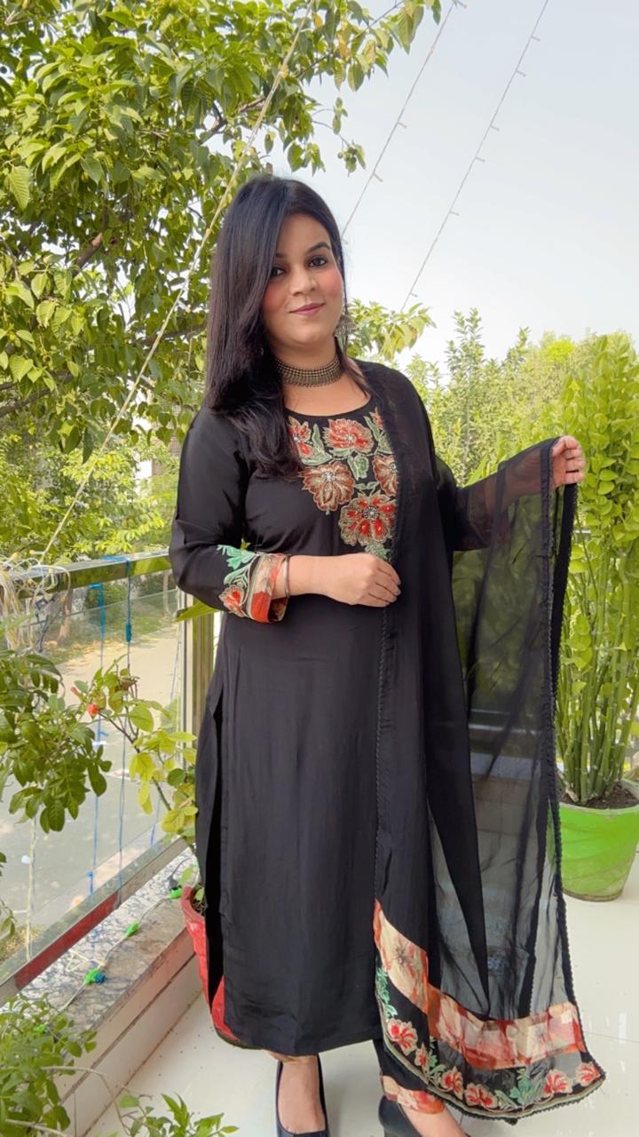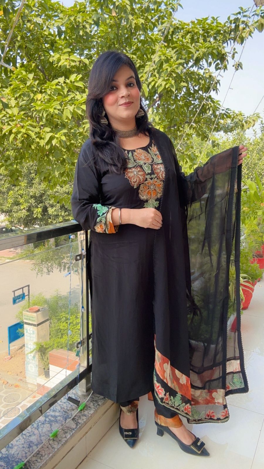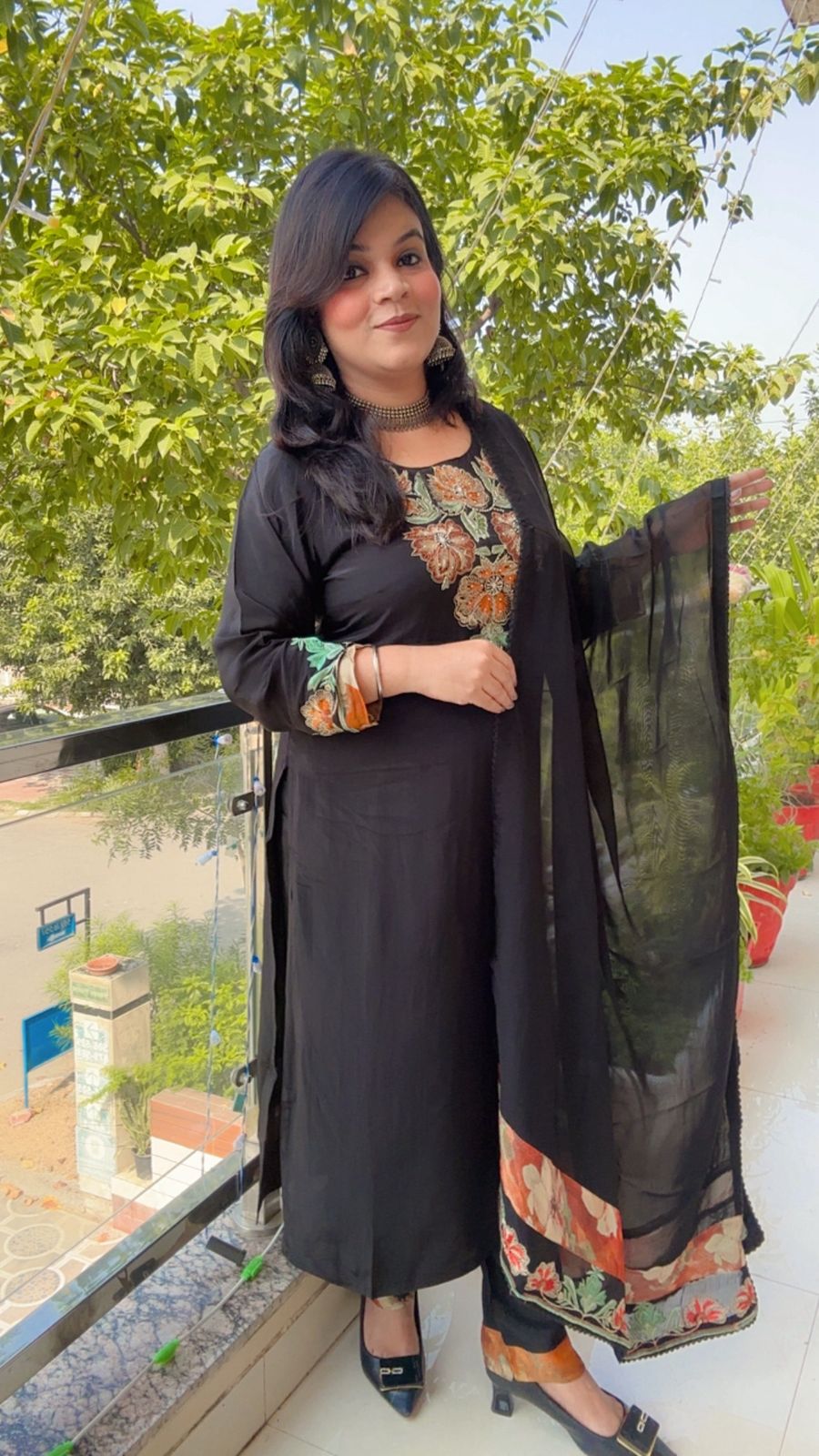 Classic black ethnic outfit elevated with multi-colored thread work, paired with a sheer black dupatta
