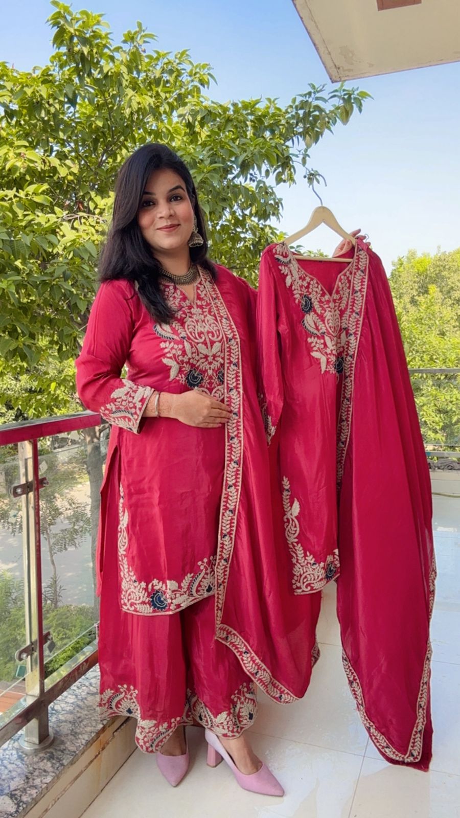 The suit is a deep pink/magenta Indian traditional outfit, likely a sharara or salwar suit with an overcoat/jacket or a heavy kurta (long shirt). It features elaborate gold and cream embroidery along the neckline, hemline of the trousers, and heavily on the jacket/overcoat/kurta, with accents of blue or darker threadwork. The fabric appears to have a slight sheen, possibly silk or a silk blend. The ensemble is completed with a matching dupatta (scarf), which also has embroidered edges. The overall look is rich and festive.