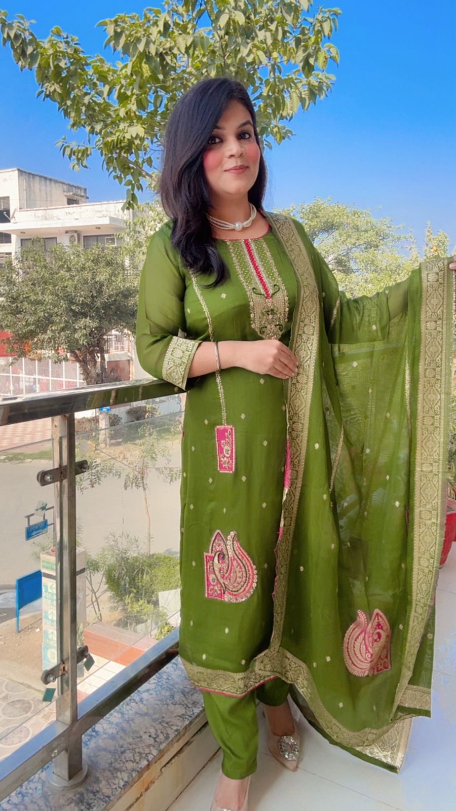 Focusing on the beautiful Sheesha work on the neckline.