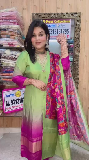 This eye-catching suit set features a beautiful ombre fade from subtle lime green at the top to a deep, striking rani pink at the hem and salwar. The luxurious silk fabric drapes elegantly, while the accompanying dupatta adds a magnificent contrast with its bold rani pink base and lively, multicolored botanical print.