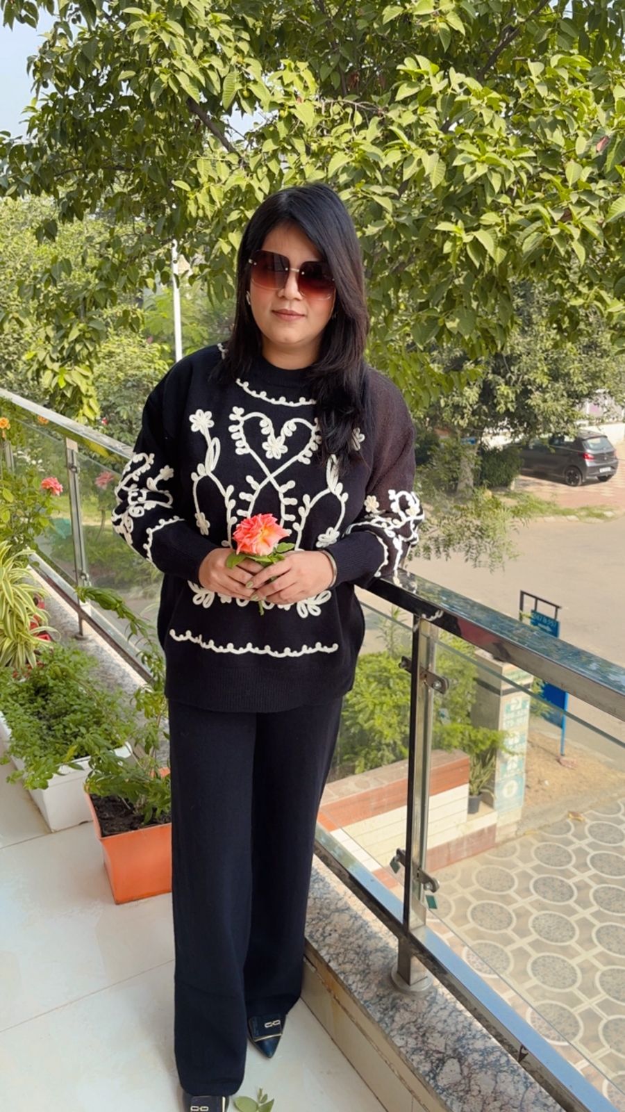 It has an Abstract Pattern (a non-geometric or unique design). The sweater is adorned with circular shapes and small beads/studs which give it a very stylish and unique texture and look.