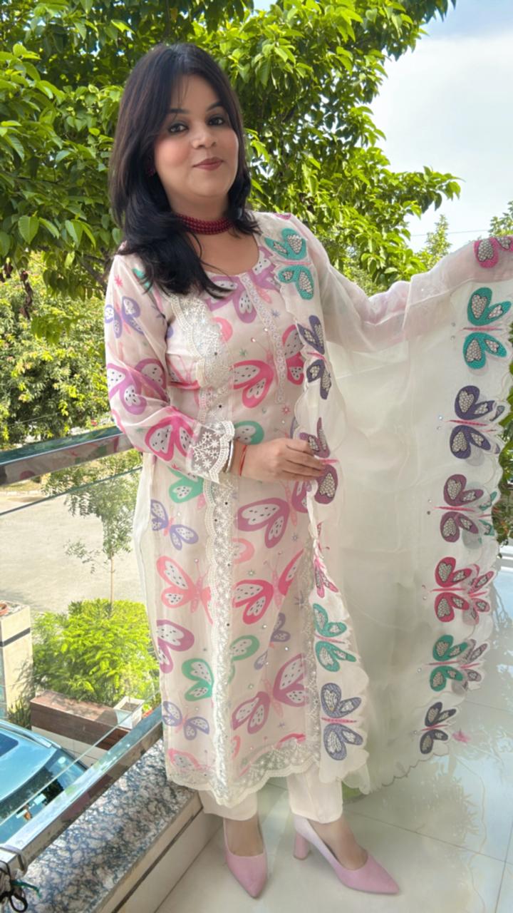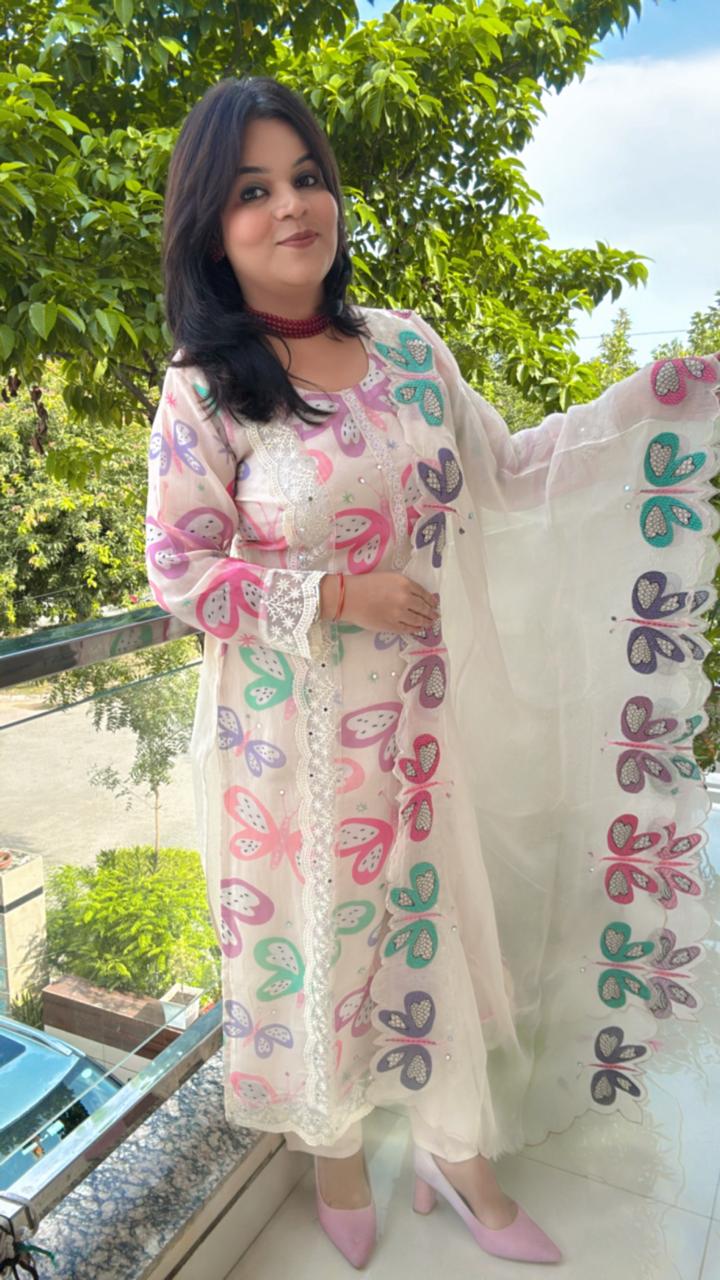The base fabric of the kurta and pants is a soft off-white or cream. The outfit is covered in a large, playful print of butterflies in a striking palette of colors, including pink, turquoise/mint, lavender/purple, and magenta