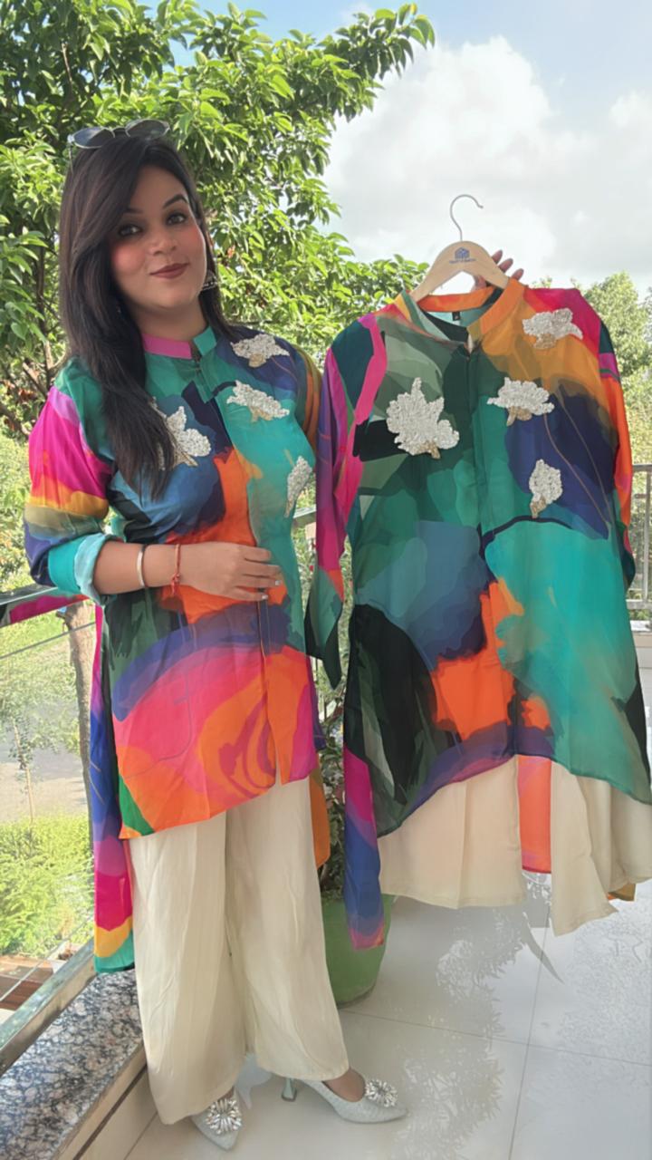 Multicolor abstract print kurti paired with cream palazzo pants. A vibrant and trendy outfit, perfect for casual outings and adding a pop of color to your style.
