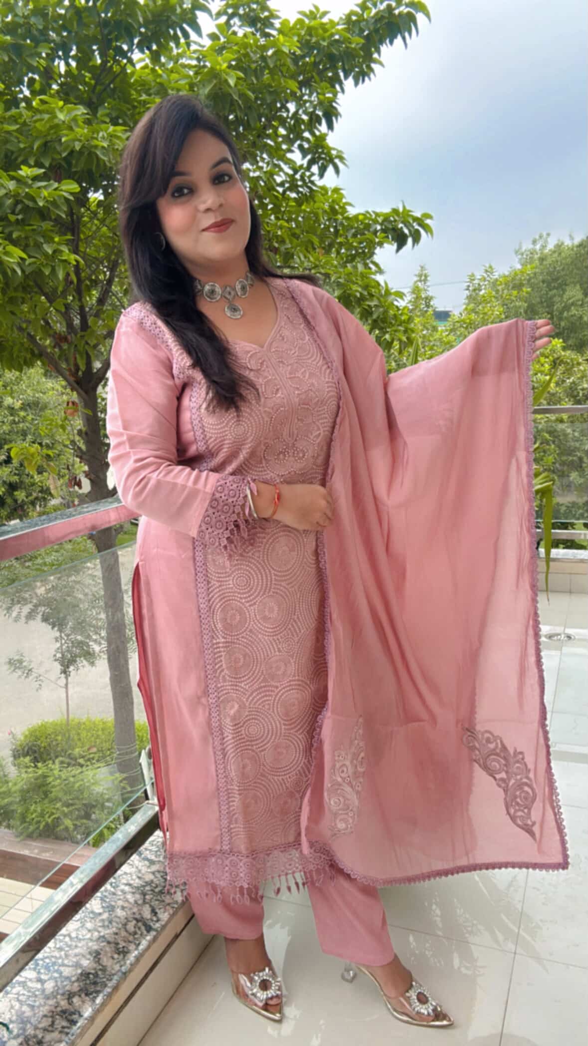Beautiful muslins onion pink embroidered set with cotton silk pants