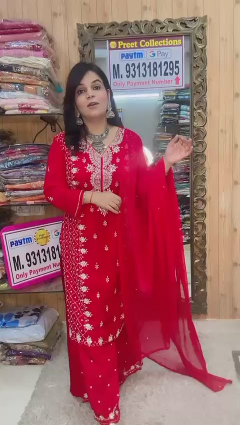 the dress is a stunning, vibrant red Chinon silk palazzo suit that exudes festive elegance. This traditional Indian three-piece ensemble features a long kurta (top) and wide-legged palazzo pants, all crafted from fluid Chinon silk. The outfit is heavily embellished with intricate white/silver handwork