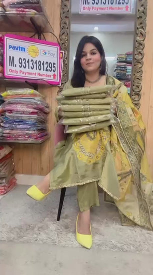 Elegant sage green suit featuring a vibrant, traditional yellow and green printed dupatta.