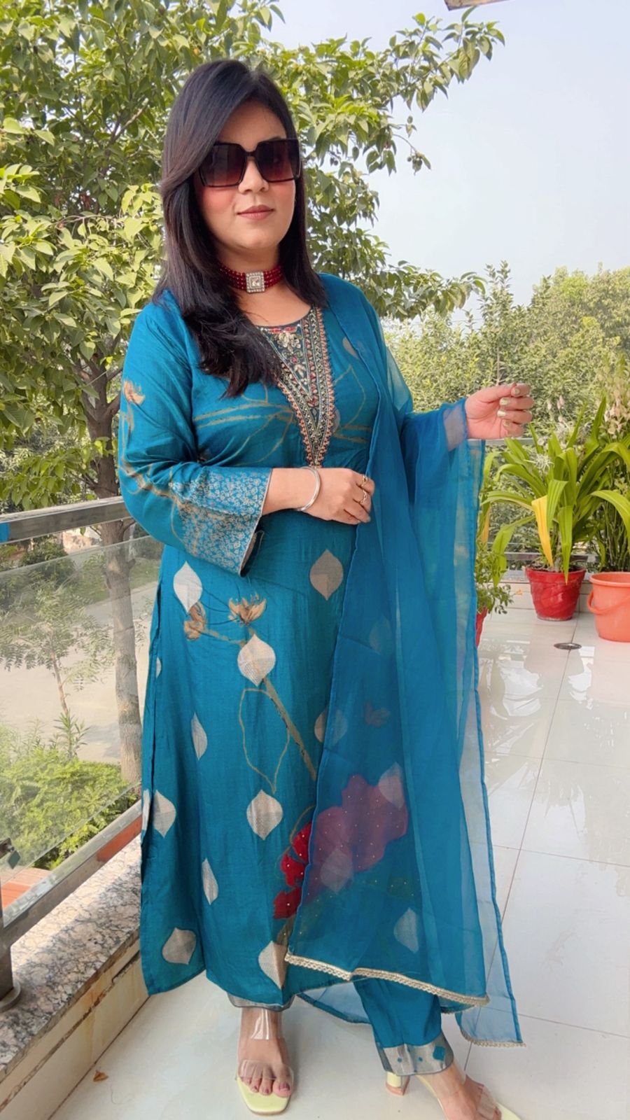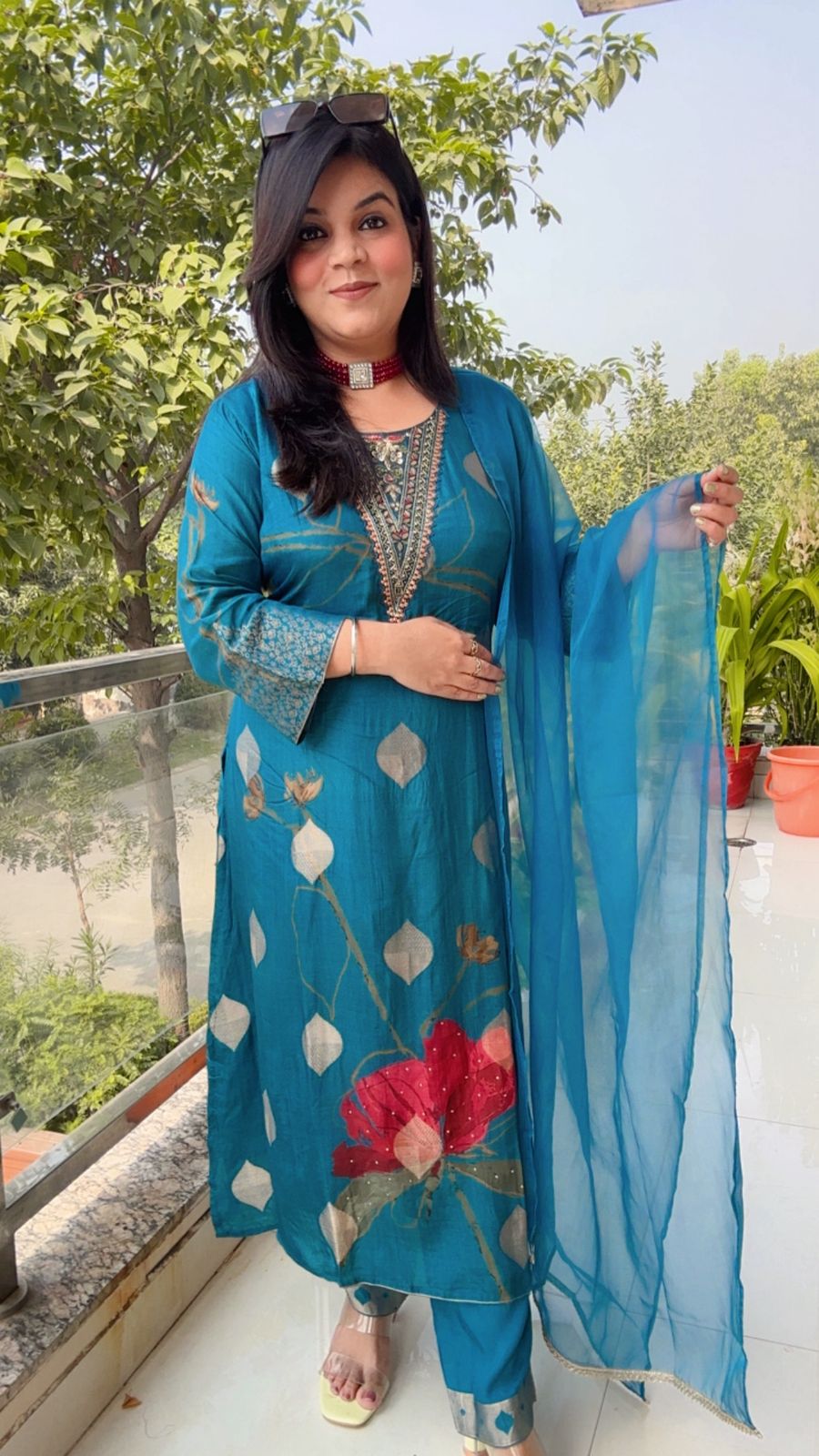 The kurta features large, artistic printed or painted floral motifs in shades of white, pale gold, and a touch of red. These motifs are spaced out across the front of the kurta, giving it a modern, elegant, and almost watercolor-like effect.