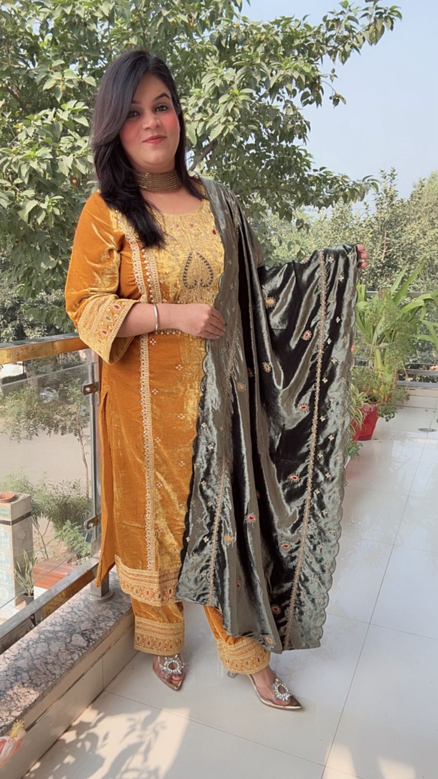 The main body of the suit (kurta and pants) is a luxurious, vibrant Mustard Yellow or Deep Gold color. Like the other suits, it is made of crushed velvet.