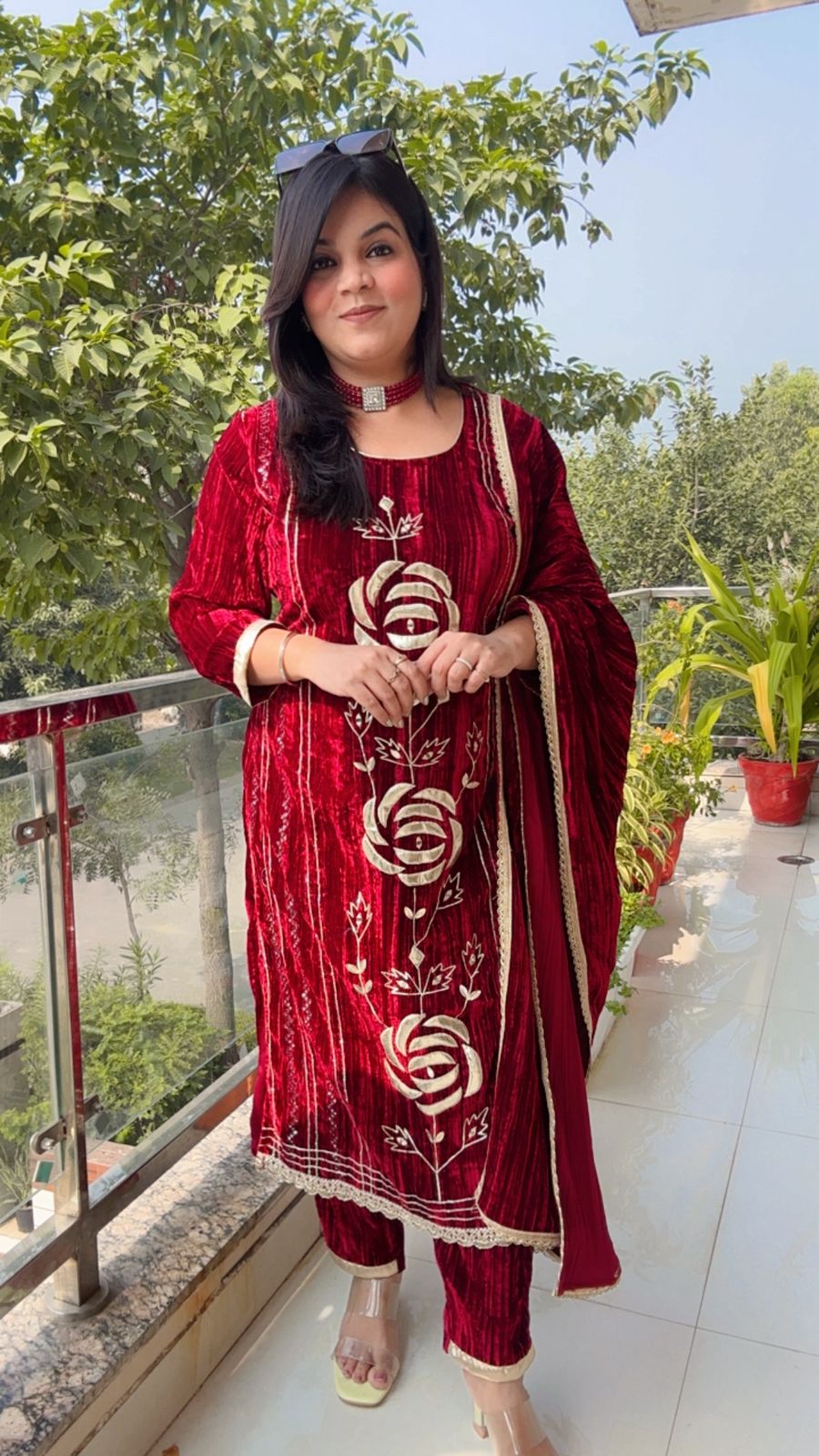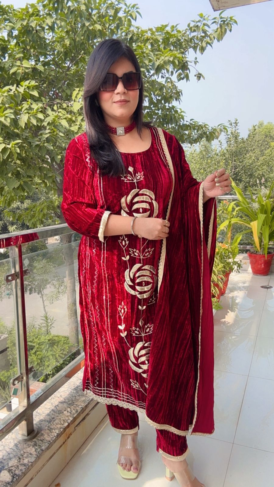 Rich Velvet fabric with large, stylized gold zari embroidery and matching velvet dupatta.
